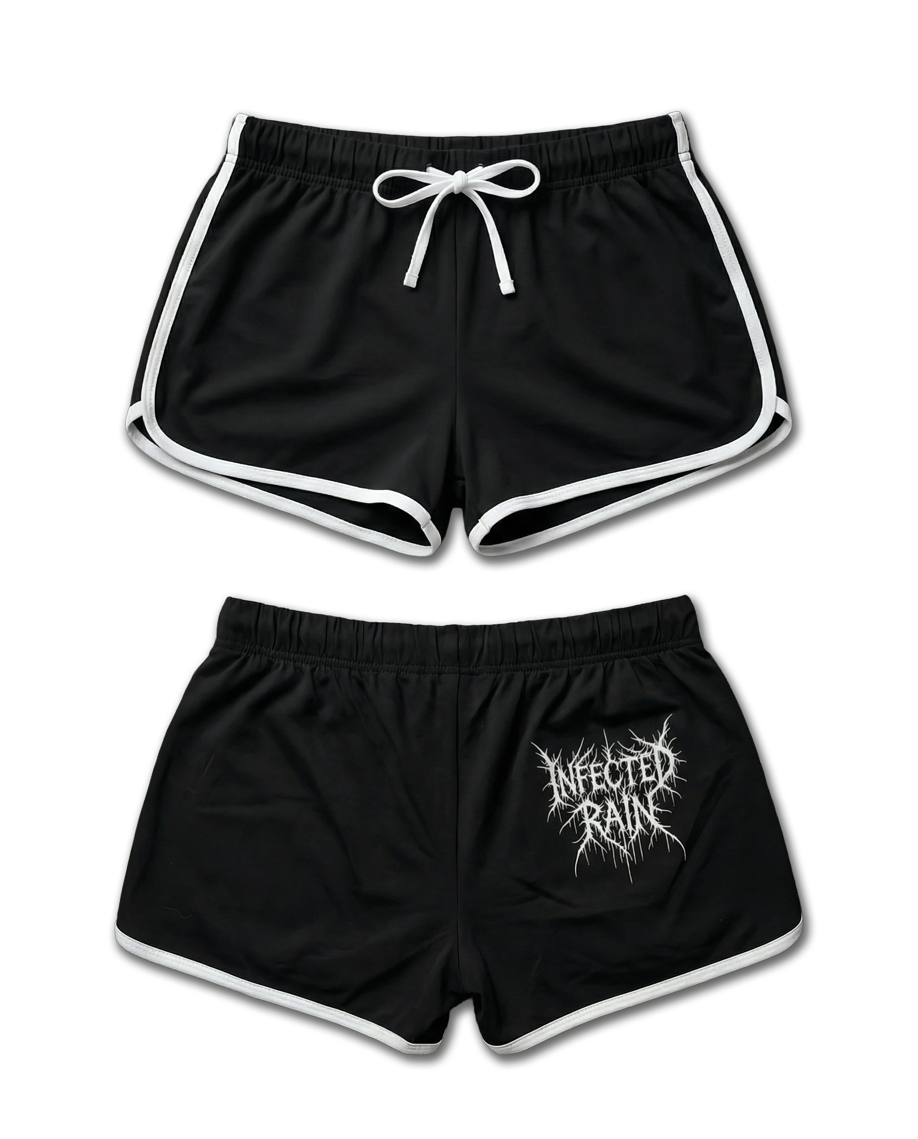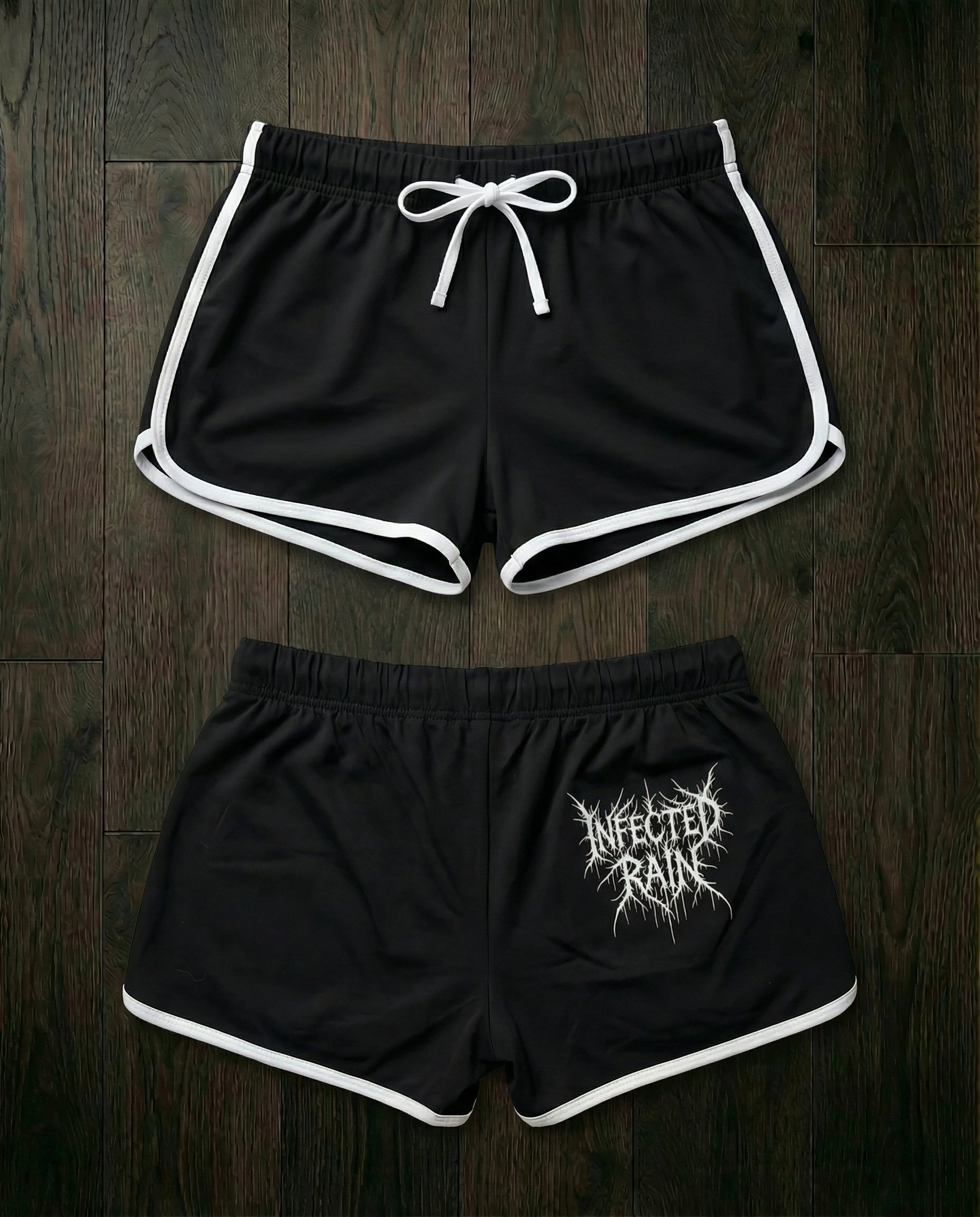 Black sporty shorts with white trim and waistband, featuring the white spiked INFECTED RAIN artwork on the back.